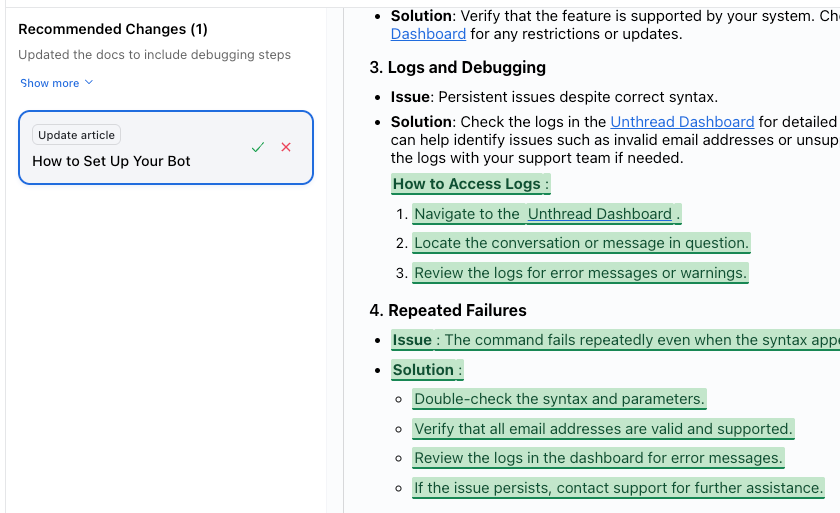 Last year, we launched our first version of our knowledge gap analysis feature, which automatically learns from previous ticket data and Slack messages to generate updates or new documentation.